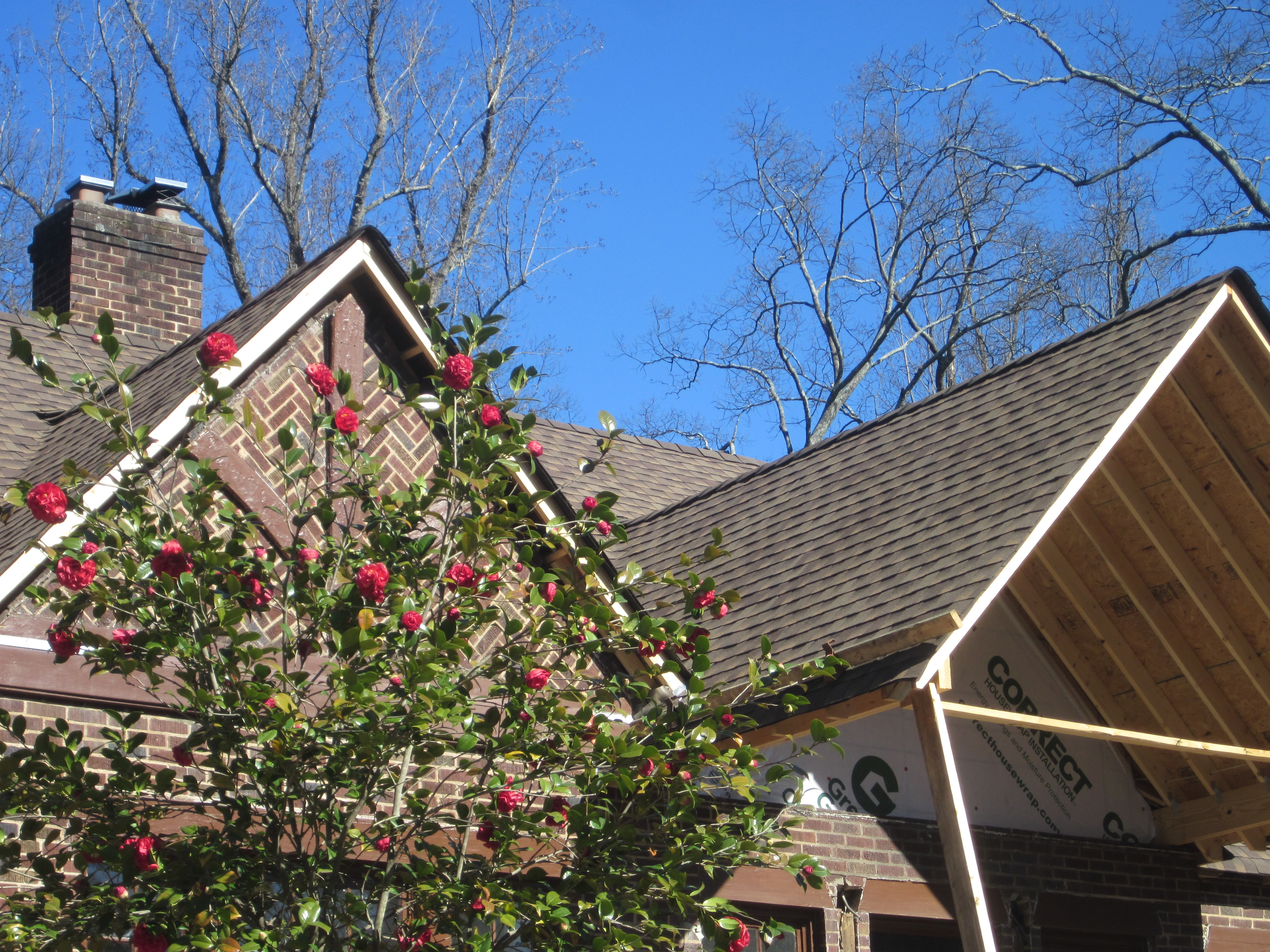 One piece of advice, I would strongly recommend that before the shingles are installed that you inspect a few of them just to make sure they’re the same color as to what you’re expecting.  While we confirmed that what was written on each of the packages was the same as what was ordered, we personally neglected to actually view the shingles and when we saw them on the roof we were somewhat disappointed as they seemed a little lighter in color than what we saw on the shingle board, as well as what we viewed online.  (GAF also recommends the above on their website)  They all came from the same batch however they’re definitely lighter, my hope is that once the trim is added and the brick is painted that less of the redness in the shingles will be highlighted and the brown will become more dominant.