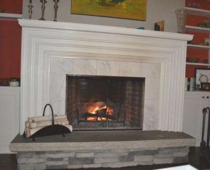 Now it looked great, white marble tile framed by an off-white mantel with a stone hearth, plus we wouldn’t have to go out and spend any additional money.
